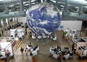 (251111) -- BELEM, 11 noviembre, 2025 (Xinhua) -- Un globo terráqueo que ilustra el cambio climático es visto durante la...