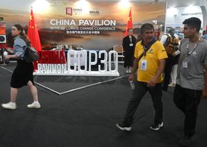 (251111) -- BELEM, 11 noviembre, 2025 (Xinhua) -- Personas caminan frente al Pabellón de China durante la 30ª Conferencia de...