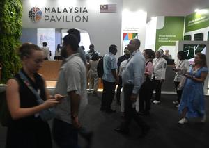 (251111) -- BELEM, 11 noviembre, 2025 (Xinhua) -- Personas caminan frente al Pabellón de Malasia durante la 30ª Conferencia de...