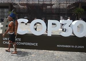(251111) -- BELEM, 11 noviembre, 2025 (Xinhua) -- Un indígena camina frente al logotipo de la 30ª Conferencia de las...