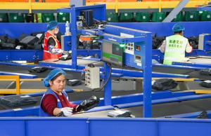 (251111) -- BEIJING, 11 noviembre, 2025 (Xinhua) -- Trabajadores laboran en una línea de clasificación automática de paquetes en una...