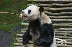 (251110) -- ADELAIDA, 10 noviembre, 2025 (Xinhua) -- La panda gigante Yilan come bambú en el Zoológico de Adelaida, en...