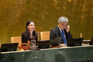 (251112) -- NACIONES UNIDAS, 12 noviembre, 2025 (Xinhua) -- Annalena Baerbock (i), presidenta de la Asamblea General de la ONU,...