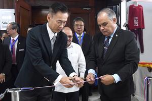 (251112) -- ARTEMISA, 12 noviembre, 2025 (Xinhua) -- El embajador de China en Cuba, Hua Xin (i-atrás), pronuncia un discurso...