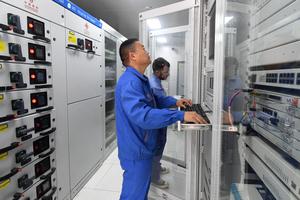 (251112) -- ARTEMISA, 12 noviembre, 2025 (Xinhua) -- Un técnico chino (frente) y un técnico cubano (atrás) trabajan en una...