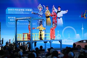(251114) -- TIANJIN, 14 noviembre, 2025 (Xinhua) -- Concursantes del Colegio Vocacional de Arte de Shaanxi (División de Educación Vocacional...