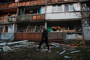 (251114) -- KIEV, 14 noviembre, 2025 (Xinhua) -- Un hombre limpia el balcón de un edificio residencial dañado tras los...