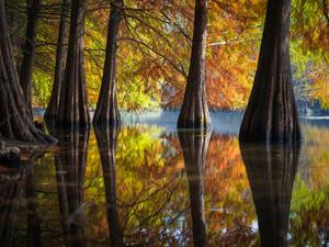 (251114) -- HUANGSHAN, 14 noviembre, 2025 (Xinhua) -- Imagen tomada con dron de turistas disfrutando del paisaje del lago Qishu,...