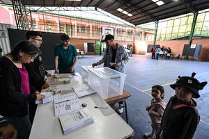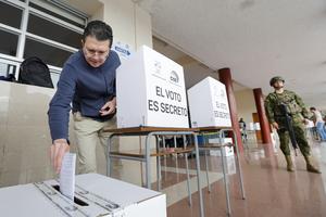 (251116) -- QUITO, 16 noviembre, 2025 (Xinhua) -- Un ciudadano deposita su papeleta en una urna durante la jornada electoral...
