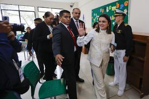 (251116) -- QUITO, 16 noviembre, 2025 (Xinhua) -- La vicepresidenta ecuatoriana, María José Pinto (2-d), se retira del colegio electoral...
