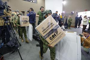 (251114) -- QUITO, 14 noviembre, 2025 (Xinhua) -- Miembros de las Fuerzas Armadas trasladan los paquetes electorales destinados a la...