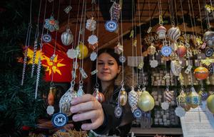 (251115) -- VANCOUVER, 15 noviembre, 2025 (Xinhua) -- Imagen del 14 de noviembre de 2025 de una vendedora mostrando adornos...