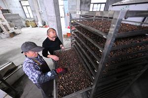 (251119) -- FUZHOU, 19 noviembre, 2025 (Xinhua) -- Imagen del 18 de noviembre de 2025 de trabajadores revisando frutos secos...