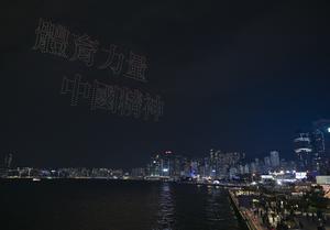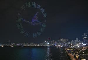 (251118) -- HONG KONG, 18 noviembre, 2025 (Xinhua) -- Un espectáculo de luz con drones que celebra el espíritu deportivo...