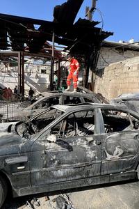(251119) -- SIDON, 19 noviembre, 2025 (Xinhua) -- Un rescatista inspecciona vehículos destruidos en un ataque aéreo israelí, en el...