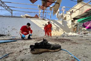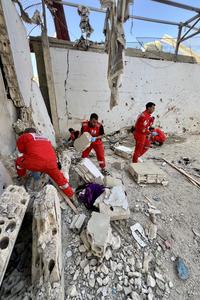 (251119) -- SIDON, 19 noviembre, 2025 (Xinhua) -- Rescatistas inspeccionan el sitio de un ataque aéreo israelí, en el campamento...