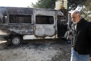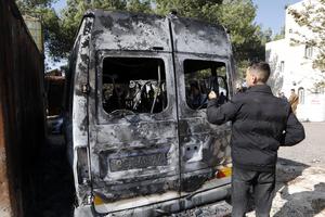 (251118) -- BELEN, 18 noviembre, 2025 (Xinhua) -- Palestinos inspeccionan un vehículo quemado, en la aldea de Al-Jaba, en la...