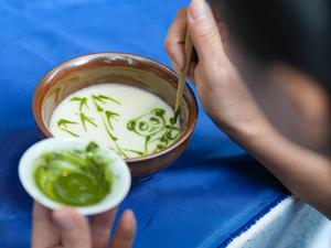 (251121) -- CHENGDU, 21 noviembre, 2025 (Xinhua) -- Un técnico de té dibuja un patrón de panda mientras prepara té...