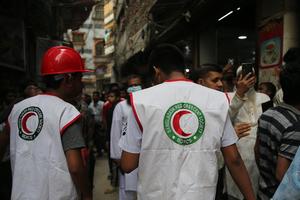 (251121) -- DHAKA, 21 noviembre, 2025 (Xinhua) -- Rescatistas locales trabajan en un área afectada por un terremoto, en Dhaka,...