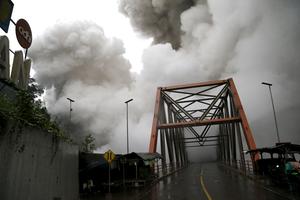 (251121) -- LUMAJANG, 21 noviembre, 2025 (Xinhua) -- Imagen del 21 de noviembre de 2025 de humo y materiales volcánicos...