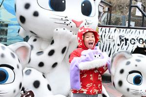 (251122) -- XINING, 22 noviembre, 2025 (Xinhua) -- Un niño se toma fotografías frente de esculturas de leopardo de las...