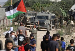 (251124) -- TULKARM, 24 noviembre, 2025 (Xinhua) -- Imagen del 23 de noviembre de 2025 de un palestino manifestándose para...