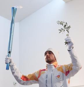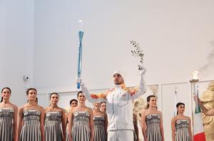 (251126) -- ANTIGUA OLIMPIA, 26 noviembre, 2025 (Xinhua) -- El primer portador de la antorcha, el remero griego, Petros Gkaidatzis,...