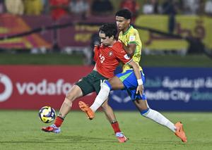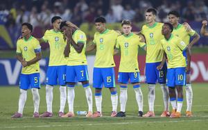 (251125) -- DOHA, 25 noviembre, 2025 (Xinhua) -- Imagen del 24 de noviembre de 2025 de jugadores de Brasil reaccionando...