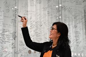 (251125) -- LAUSANA, 25 noviembre, 2025 (Xinhua) -- Imagen del 24 de noviembre de 2025 de la entrenadora china de voleibol, Lang Ping, firmando su nombre en el Muro de los Olímpicos después de recibir el Premio del Comité Olímpico Internacional (COI) para Entrenadores por su Trayectoria 2025, en la Casa Olímpica, en Lausana, Suiza. El COI honró el lunes a la entrenadora china de voleibol, Lang Ping, y al entrenador cubano de lucha, Raúl de Jesús Trujillo Díaz con el Premio del COI para Entrenadores por su Trayectoria 2025 en la Casa Olímpica aquí. (Xinhua/Lian Yi) (oa) (ah) (ce)