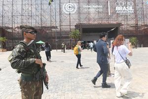 (251113) -- BELEM, 13 noviembre, 2025 (Xinhua) -- Un soldado del Ejército brasileño vigila en el exterior del pabellón en...
