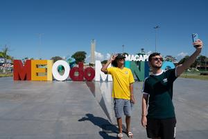 (251110) -- AMAPA, 10 noviembre, 2025 (Xinhua) -- Imagen del 9 de noviembre de 2025 de visitantes tomándose una fotografía...