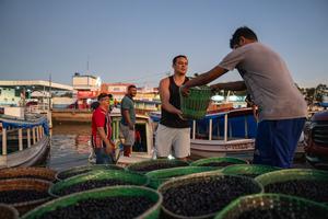 (251110) -- AMAPA, 10 noviembre, 2025 (Xinhua) -- Imagen del 9 de noviembre de 2025 de empleados descargando frutas frescas...
