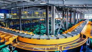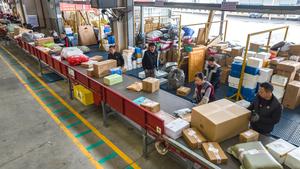 (251110) -- BEIJING, 10 noviembre, 2025 (Xinhua) -- Empleados trabajan en una línea automatizada de clasificación de paquetes de una...