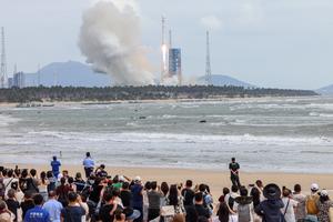 (251110) -- WENCHANG, 10 noviembre, 2025 (Xinhua) -- Un cohete portador Gran Marcha-12 transportando el grupo número 13 de satélites...