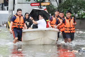 (251110) -- CIUDAD DE NAVOTAS, 10 noviembre, 2025 (Xinhua) -- Rescatistas usan un bote para evacuar a residentes de un...