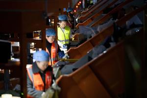 (251110) -- HARBIN, 10 noviembre, 2025 (Xinhua) -- Empleadas acomodan paquetes en una rama de China Post, en Harbin, en...