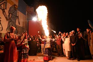 (251108) -- ISLAMABAD, 8 noviembre, 2025 (Xinhua) -- Imagen del 7 de noviembre de 2025 de artistas folclóricos realizando una...
