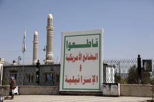 (251105) -- SANA, 5 noviembre, 2025 (Xinhua) -- Una valla publicitaria que llama al boicot de Estados Unidos e Israel...
