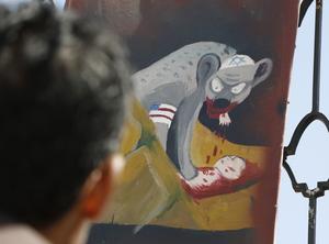 (251105) -- SANA, 5 noviembre, 2025 (Xinhua) -- Un hombre observa un cartel anti Estados Unidos e Israel, en Saná,...