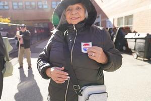 (251104) -- NUEVA YORK, 4 noviembre, 2025 (Xinhua) -- Una mujer muestra una pegatina de voto afuera de un colegio...