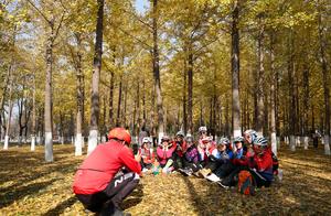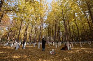 (251104) -- TIANJIN, 4 noviembre, 2025 (Xinhua) -- Ciclistas posan para una fotografía en un bosque de ginkgos en un...