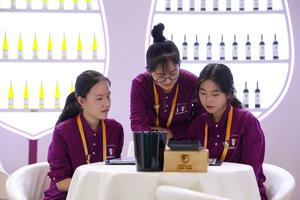 (251104) -- SHANGHAI, 4 noviembre, 2025 (Xinhua) -- Trabajadoras de un expositor de vinos francés realizan preparativos en su estand...