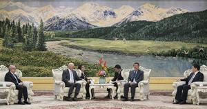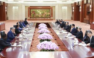 (251104) -- BEIJING, 4 noviembre, 2025 (Xinhua) -- El presidente chino, Xi Jinping, se reúne con el primer ministro ruso,...