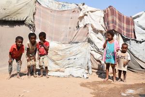 (251103) -- ADEN, 3 noviembre, 2025 (Xinhua) -- Niños desplazados se ponen de pie cerca de sus tiendas de campaña...