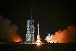 (251031) -- JIUQUAN, 31 octubre, 2025 (Xinhua) -- Imagen combinada de la nave espacial tripulada Shenzhou-21, colocada sobre el cohete...