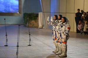 (251031) -- JIUQUAN, 31 octubre, 2025 (Xinhua) -- Los astronautas chinos, Zhang Lu (c), Wu Fei (d) y Zhang Hongzhang...