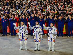 (251031) -- JIUQUAN, 31 octubre, 2025 (Xinhua) -- Los astronautas chinos, Zhang Lu (frente), Wu Fei (c) y Zhang Hongzhang...