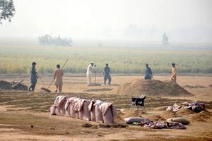 (251030) -- LAHORE, 30 octubre, 2025 (Xinhua) -- Agricultores trabajan en un campo envuelto por esmog, en Lahore, Pakistán, el...