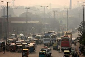 (251030) -- LAHORE, 30 octubre, 2025 (Xinhua) -- Vehículos son vistos en una carretera envuelta por esmog, en Lahore, Pakistán,...