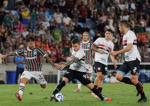 (251128) -- RIO DE JANEIRO, 28 noviembre, 2025 (Xinhua) -- Imagen del 27 de noviembre de 2025 del jugador Luciano Acosta (i), de Fluminense, disputando el balón con Felipe Negrucci (2-d), de Sao Paulo, durante el partido correspondiente a la jornada 36 del Campeonato Brasileño Serie A, celebrado en el Estadio Maracaná, en Río de Janeiro, Brasil. (Xinhua/Claudia Martini) (cm) (rtg) (ra) (vf)